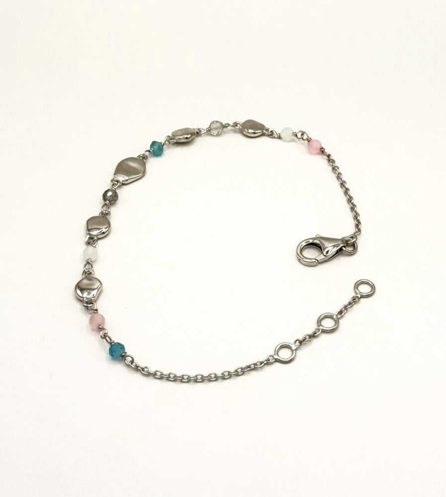 سوار راقٍ مصنوع يدويًا من فضة خالصة عيار ٩٢٥، مطلي بطبقة روديوم فاخرة تحافظ على اللمعة وتمنحه مظهراً أنيقاً يدوم. مطعّم بأحجار الروز كوارتز (Rose Quartz) بلونها الوردي الناعم وأحجار الأكوامارين (Aquamarine) بلونها الأزرق السماوي الساحر، ليمنحك لمسة من النعومة والصفاء. تصميمه الأنثوي البسيط يجعله مناسبًا للإطلالات اليومية والمناسبات الخاصة.