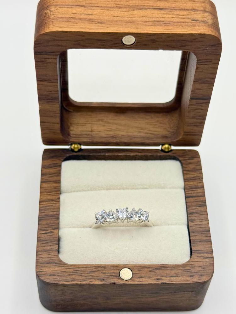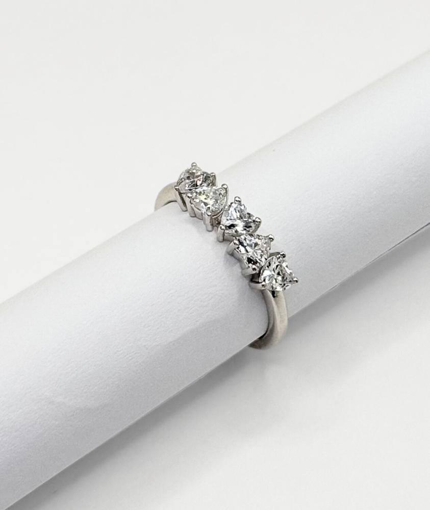 يتميز الخاتم بترصيع أنيق بـ خمسة أحجار زركون براقة على شكل قلوب تضيف له لمسة رومانسية تجمع بين الأنوثة والفخامة.